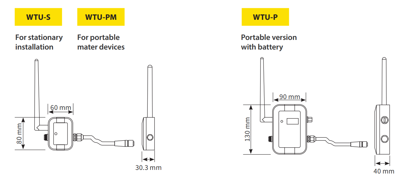 Dimensions | WTU-S & WTU-PM: 80 x 60 x 30.3 mm WTU-P: 130 x 90 x 40 mm | ||