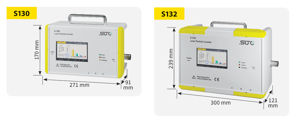 Measuring channels | S130: CH1: 0.3 < d ≤ 0.5 μm CH2: 0.5 < d ≤ 1.0 μm CH3: 1.0 < d ≤ 5.0 μm CH4: 5.0 μm < d (configurable) S132: CH1: 0.1 < d ≤ 0.5 μm CH2: 0.5 < d ≤ 1.0 μm CH3: 1.0 < d ≤ 5.0 μm CH4: 5.0 μm < d (configurable) | Display | ||||||